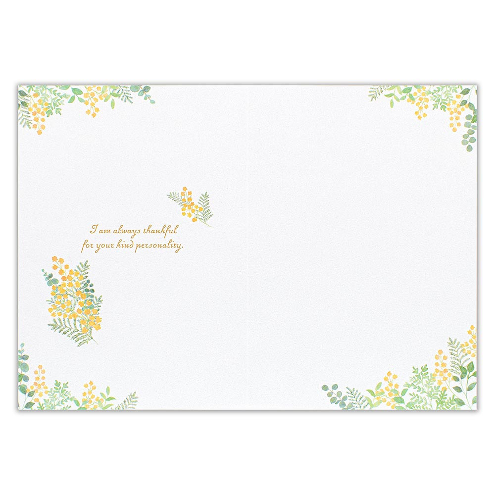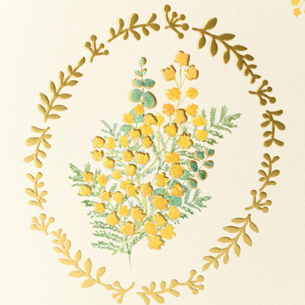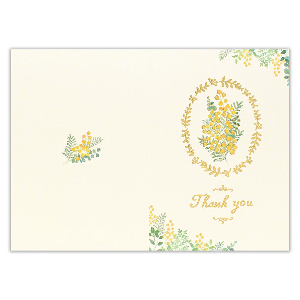 「感謝」の花言葉をもつミモザを水彩タッチで優しく描いたお礼カードです。